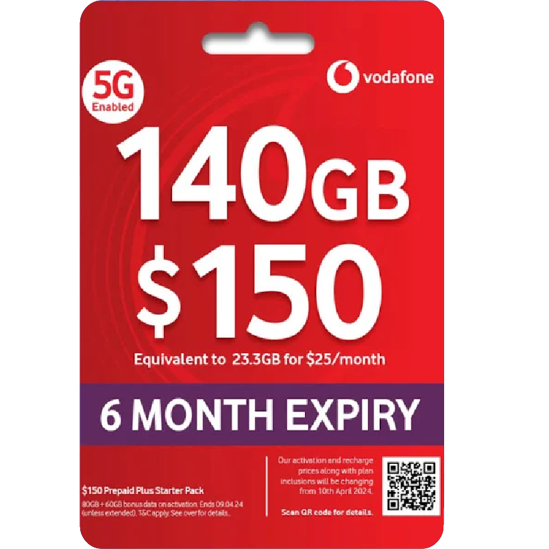 Home / eSIM Plans / Vodafone 140GB Vodafone 140GB$150.00 Vodafone $150 Prepaid SIM Card 140GB Data, Unlimited Calls Startup Pack 6 months, T&C apply. Out of stock Category: eSIM Plans Product ID: 5818